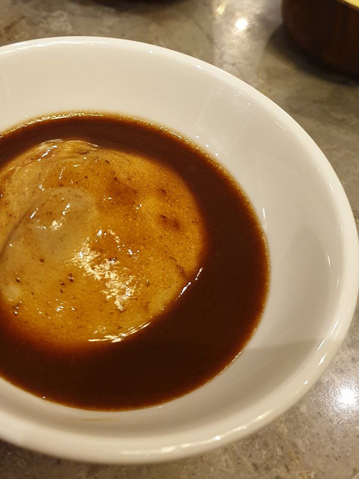 Saint-Jacques / chicons pleine terre, vieux mimolette / café chicorée / espuma bière brune / risotto d’épeautre / malte torréfié Coup de coeur pour cette association (qui nous semblait être improbable) entre la noix de saint-jacques, le chicon (endive), la mimolette et le café. Etonnamment et à notre plus grande satisfaction, ça “match” excessivement bien. Un grand plat – Soulignons la cuisson admirable de la saint-Jacques.VIN : Saint Bris 2017 – Domaine Clotilde Davenne