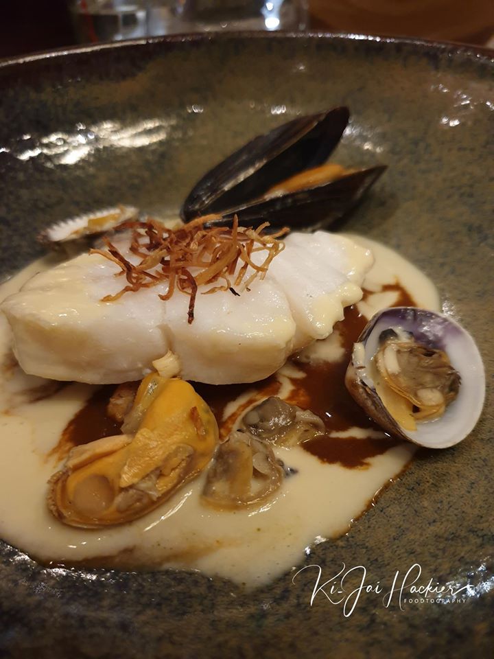 Skrei au beurre blanc /crevettes grises / coquillage et réductions de crustacésCe cabillaud du Nord-Est de l’océan Arctique, qui vit dans la mer de Barents et que l’on déguste entre les mois de janvier et avril est fort différent de son cousin. Chair plus ferme et plus du à son passage près des îles Lofoten (Danemark). Association sommes toute assez classique. A la dégustation – Plat bien exécuté, malgré cette légère sur cuisson lui amputant sa belle chair aux reflets “nacrés”.VIN : Muscadet de Sèvre et Maine “Pierres Blanches” 2016 – Domaine Luneau Papin