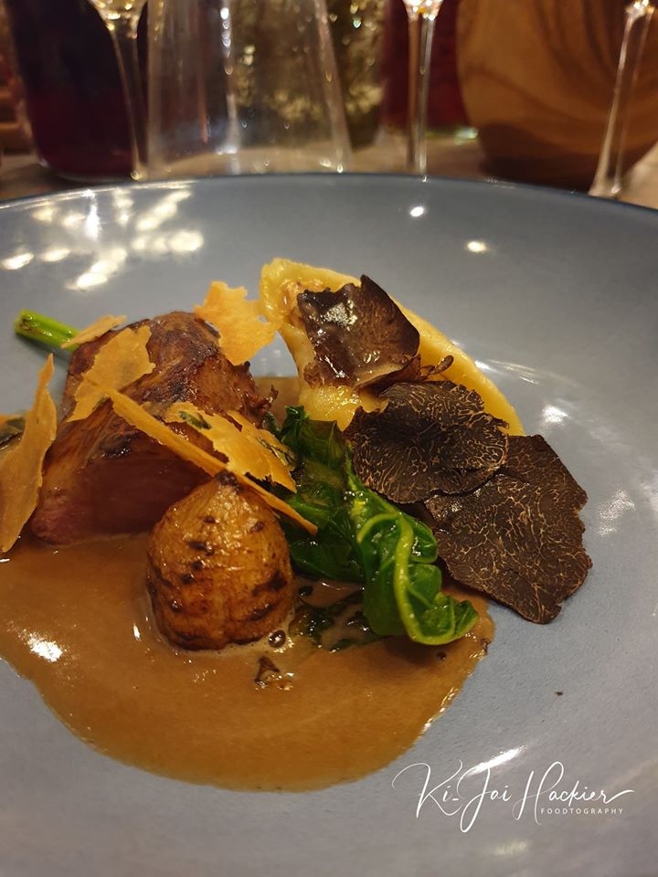 Veau de Corrèze / rigatoni truffes, ricotta / jus corsé romarin / cima di rapaC’est la fin de la saison de la tuber melanosporum. Belle idée de proposer à la dégustation ces tranches des derniers diamants noirs d’hiver (servies généreusement) avec un veau en provenance de Corrèze; accompagné d’un rigatoni farci à la ricotta truffée. Découverte de la cima di rapa – un légume délicieux juste revenu à l’huile d’olive, que nous apparenterions à des feuilles de bette. VIN : Saint Chinian 2015 – Domaine de la Madura
