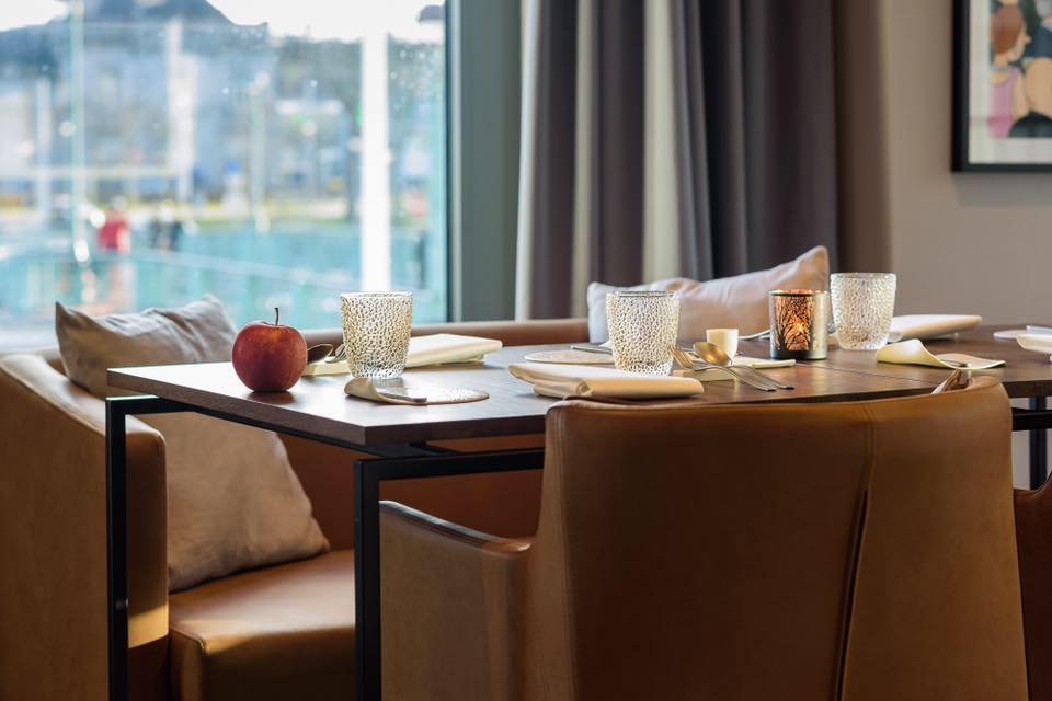Nous sommes à Charleroi, « Amarré » à l’angle de la place Buisset et des quais (non loin de la gare de Charleroi Sud), la Table de LaM.U offre, outre une cuisine créative, un très beau panoramique sur la Sambre. Lieu moderne, avec de beaux grands espaces très lumineux où le bois, le cuir et autres matériaux nobles se côtoient harmonieusement. Le tout a été mûrement réfléchi – un lieu pensé sur deux niveaux … un restaurant unique offrant deux ambiances. L’idée nous plaît car avec la même qualité de produit, on pourra soit choisir l’atmosphère confinée de l’espace à l’étage ou prendre le parti de manger au rez-de-chaussée, face à la cuisine …
