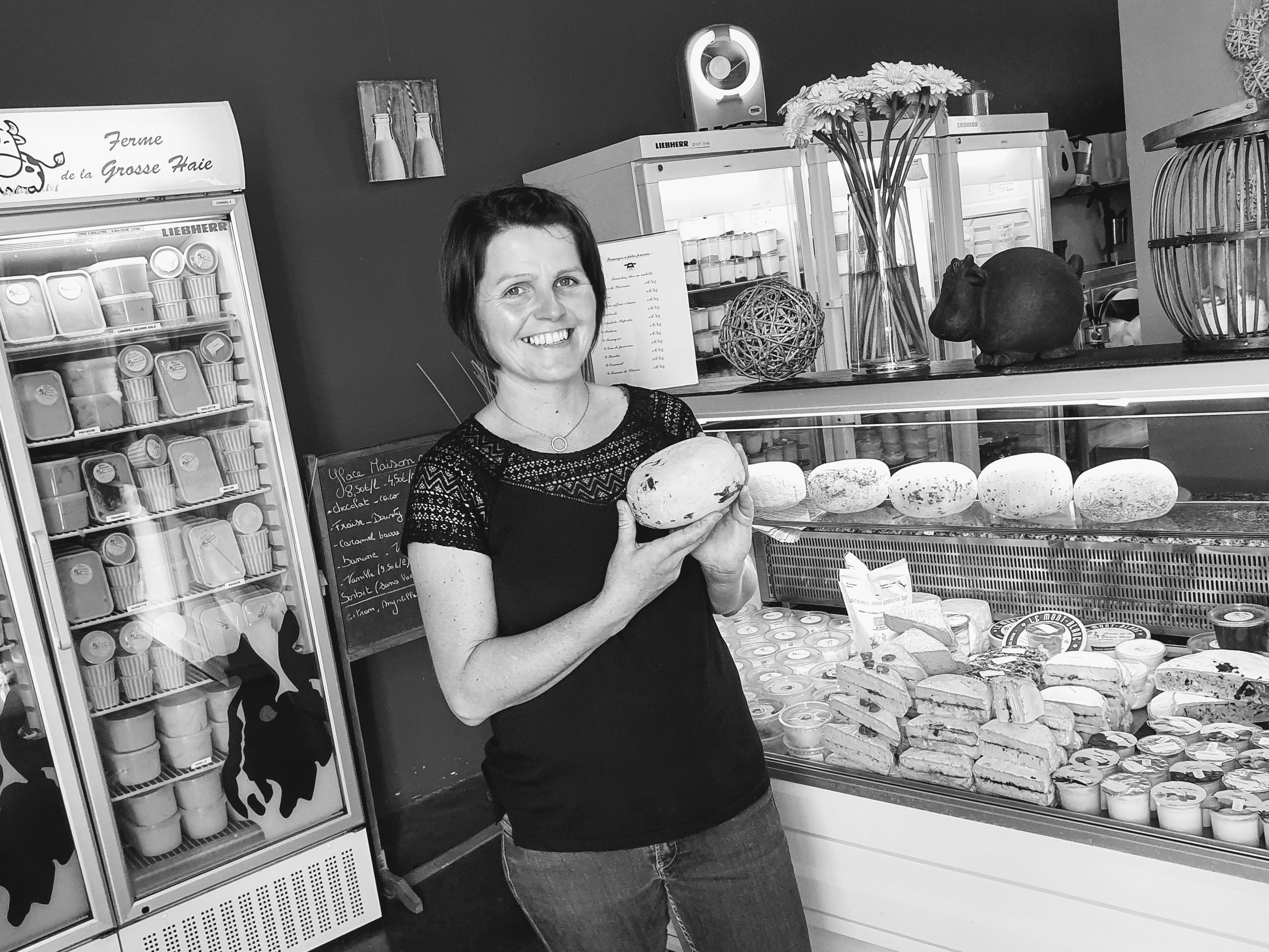 La ferme de la Grosse Haie, c’est une ferme familiale, sur plusieurs générations. Jean-Jacques Leblanc s’occupe de l’élevage, Christine du fromage. Après une quinzaine d’années dans un labo de recherches agronomiques, elle vient travailler à la ferme et investit la cave, où sa belle mère faisait le beurre auparavant. Pour elle, il n’est pas trop question de beurre, mais de fromage. Elle suit une formation à Ciney pour les fromages, une autre à Ath pour les glaces, et elle peut démarrer son activité.
