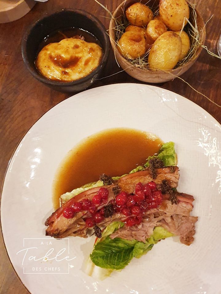 La viande une fois cuite, arrive servie avec des pommes de terre fumées, des groseilles/myrtilles fermentées et un jus de veau monté au beurre.
