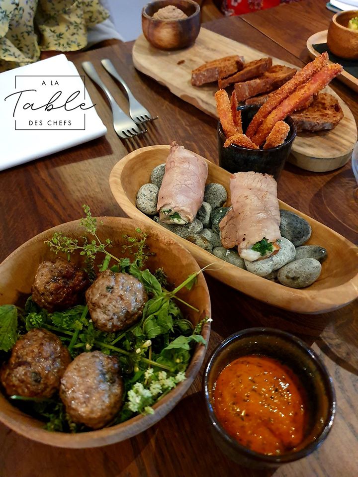 Les mises en bouche, saltimbocca de veau, boulettes de veau, mousse de foie de veau et pis de … vache (faut suivre hein