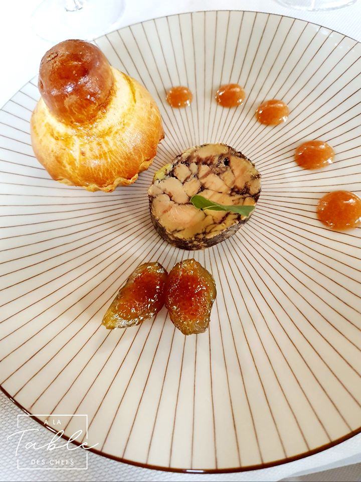 - Marbré de foie gras de canard au moût de vin, pulpe de pommes reinette