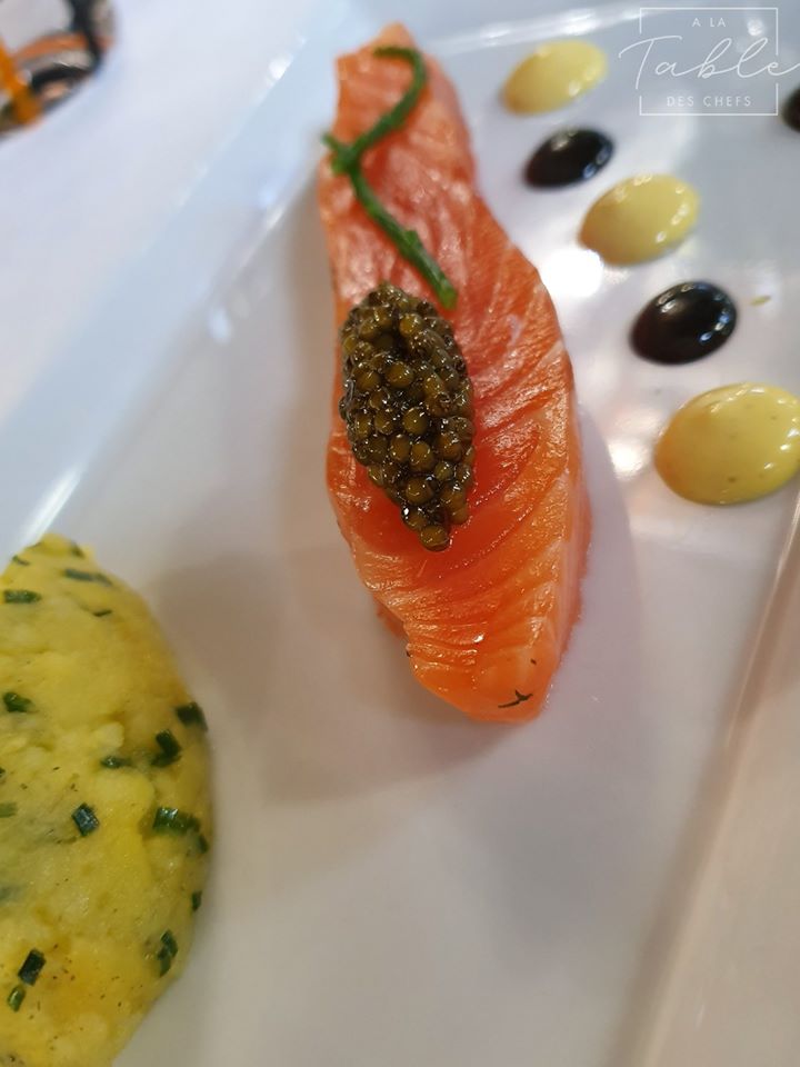 - Saumon d’Ecosse mariné au sel de Maldon, Pomme de terre écrasée à l’huile d’olive extra-vierge, caviar Impérial