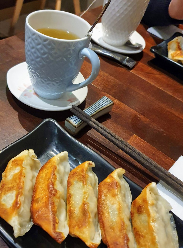 J’ai bien aimé les edamame servis chauds (6,00 €) avec cette petite pointe de fleur de sel. Les gyoza grillé (6,00 €) (raviolis japonais 餃子) avec cette « enveloppe » de pâte (à base de blé) scellée autour d’une farce au porc (ou poulet) et aux légumes étaient juste parfaits. J’aime manger ces raviolis crousti-fondant, trempés dans la sauce soja.