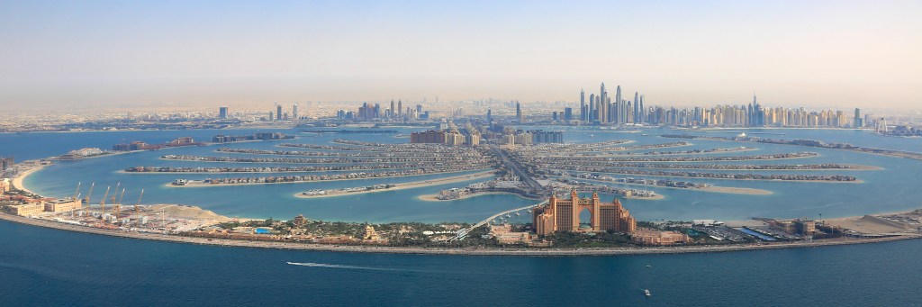 Incroyables archipels artificiels à voir depuis un avion ou depuis la tour Burj Khalifa. Vue d’en haut, l’île artificielle ressemble à un palmier stylisé, construit à partir de terres récupérées et d’une série d’archipels artificiels.