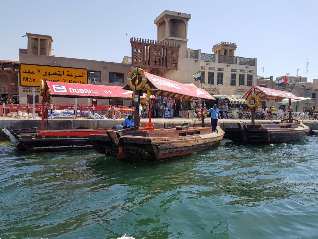 Visiter le Old Gold Souk, Spices and Utensils Souk de Deira. Prendre un abra (bateau-taxi en bois traditionnel – coût : 1 AED) au Deira Old Souk Abra Station pour traverser le Dubai Creek.