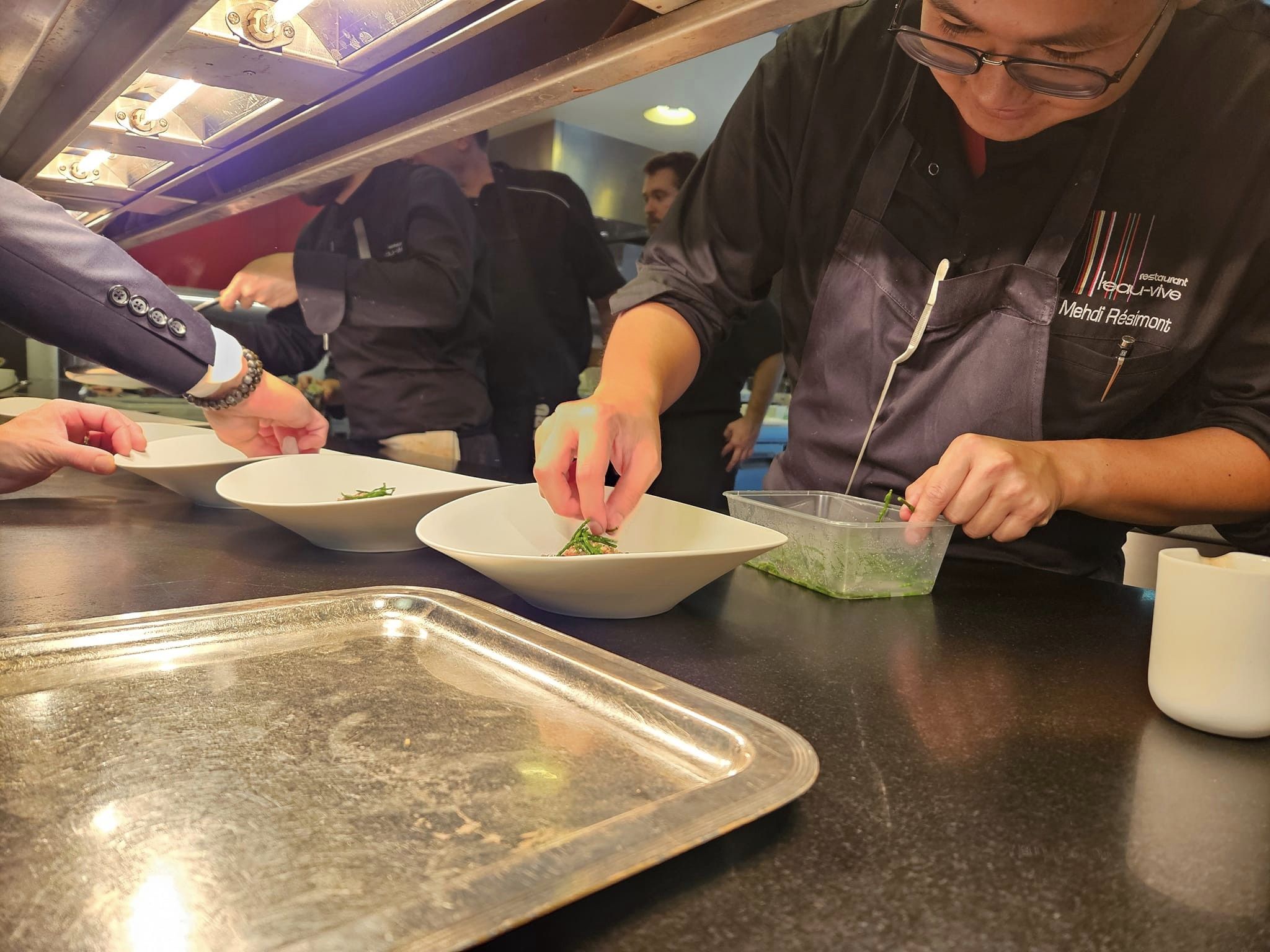 Ce samedi pour marquer un changement de décennie d’une amie, j’avais réservé la table d’hôtes de l’Eau Vive. Etre au plus près de l’action, dans une ambiance que je connaissais déjà pour y avoir moi-même fêté un anniversaire il y a quelques années. Il faut dire que le chef et moi avons un point commun : notre jour de naissance, j’essaye donc d’y aller à cette date une fois tous les deux ans
