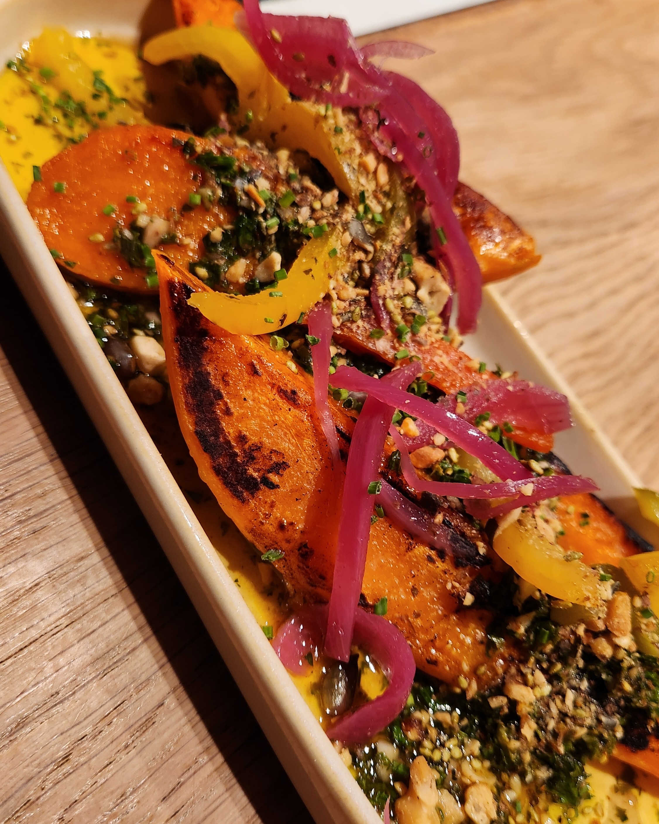 Épinards minutes – Huile de noisettes et mélanges de noix torréfiées [10 €), Carottes, miel et Xérès (11 €), Fenouil rôti – Crémeux sésame, tapenade d’olives noire et huile d’herbes (12 €)