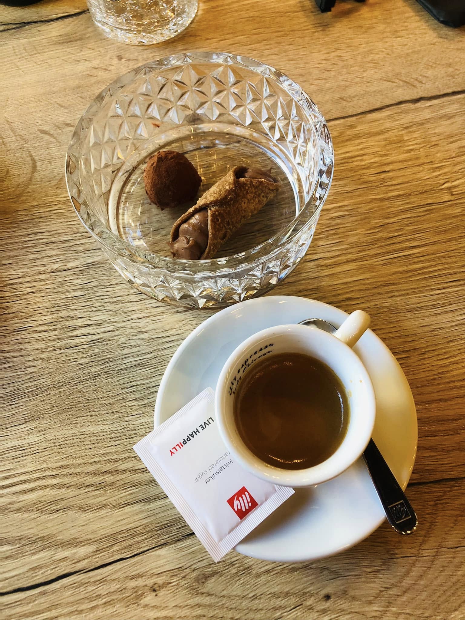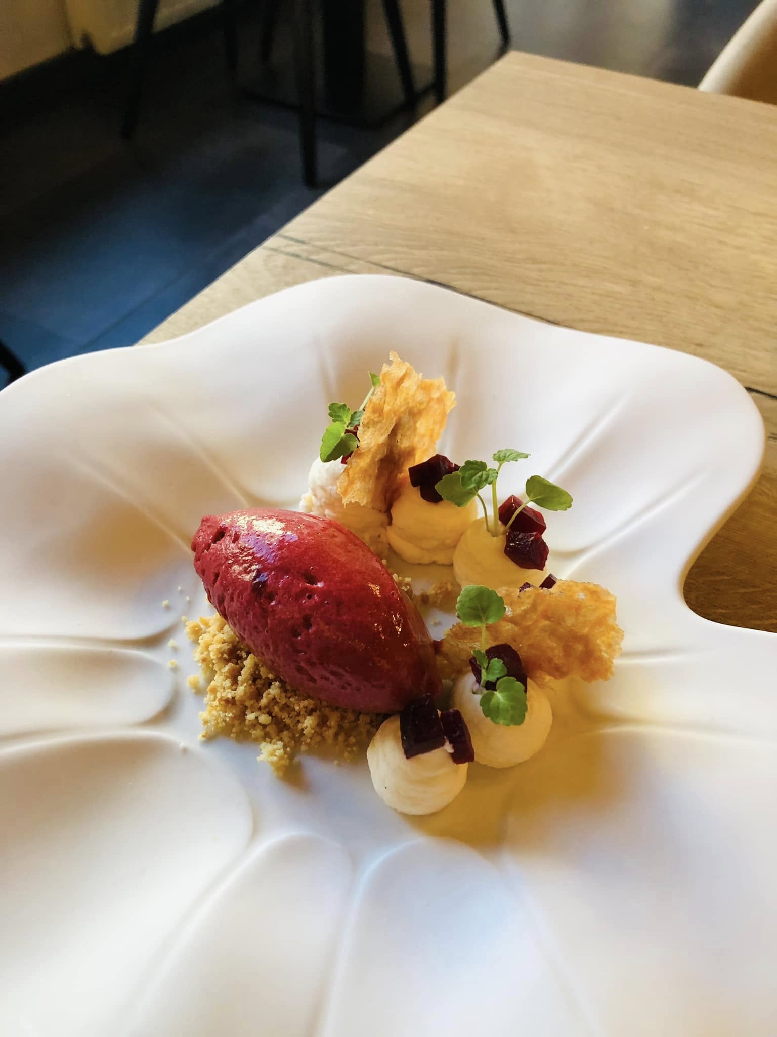 Je poursuis avec le dessert mascarpone betterave rouge, glace aux fruits rouge. Je termine par un expresso accompagnés d’une truffe tiramisu et un cannolo chocolat, vivement que j’y retourne !