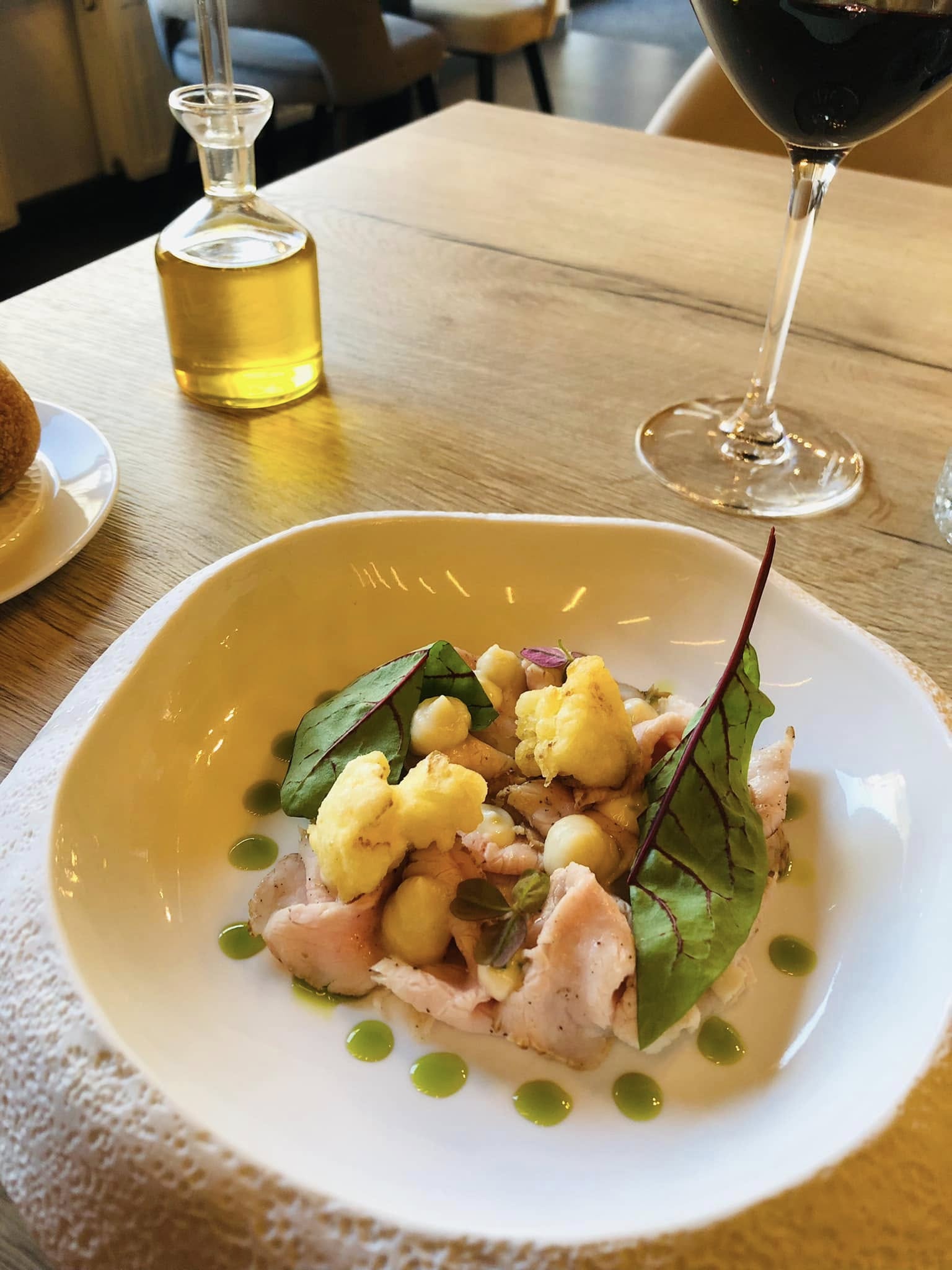 Mises en bouches : caponata et cannolo farcis à la canette. J’ai choisi le lunch avec un veau basse température, accompagné de chou-fleur en tempura et d’une mayonnaise ciboulette. Ensuite, spaghetti au ragoût de cerf (l’accord mets vin au top)
